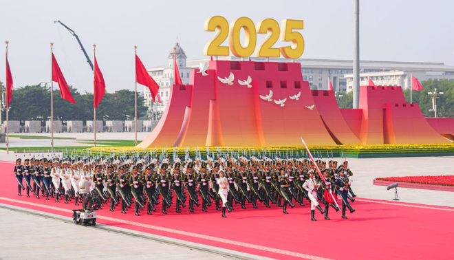 9月3日,纪念中国人民抗日战争暨世界反法西斯战争胜利80周年大会在北京隆重举行。这是国旗护卫队从人民英雄纪念碑出发,走向旗杆。