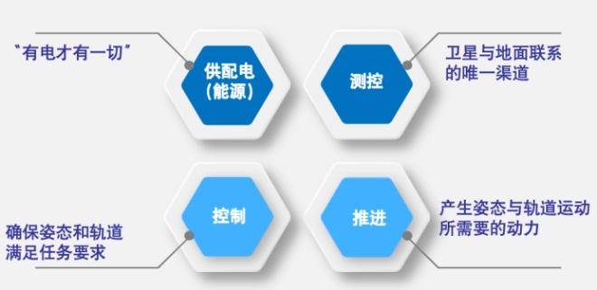 通常情况下,卫星平台都由结构、热控制、姿态轨道控制、遥测遥控、数据管理、供配电等多个分系统组成,最关键的则是四大分系统——第一个是供配电分系统,也叫能源分系统;第二个是遥测遥控分系统,也就是我们常说的测控分系统;第三个是姿态与轨道控制分系统;最后一个是推进分系统。