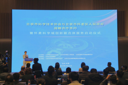 为全面学习贯彻党的二十大精神,深入落实习近平总书记在中央政治局第三次集体学习时关于加强基础研究的重要指示,动员组织科技工作者,服务创新驱动发展战略和基础研究原创力,助力北京国际科技创新中心建设,3月16日,北京市科学技术协会与怀柔区人民政府战略合作签约暨怀柔科学城创新联合体服务启动仪式在怀柔科学城创新小镇举办。市科协党组书记沈洁,怀柔区委书记、怀柔科学城党工委书记郭延红,怀柔区委副书记、区长、怀柔科学城党工委副书记、科学城管委会主任于庆丰,全国政协委员、中国工程院院士、国际欧亚科学院院士武强,中科院科技创新发展中心党委书记、主任姜晓明,中关村发展集团副总经理伍发平出席启动仪式。