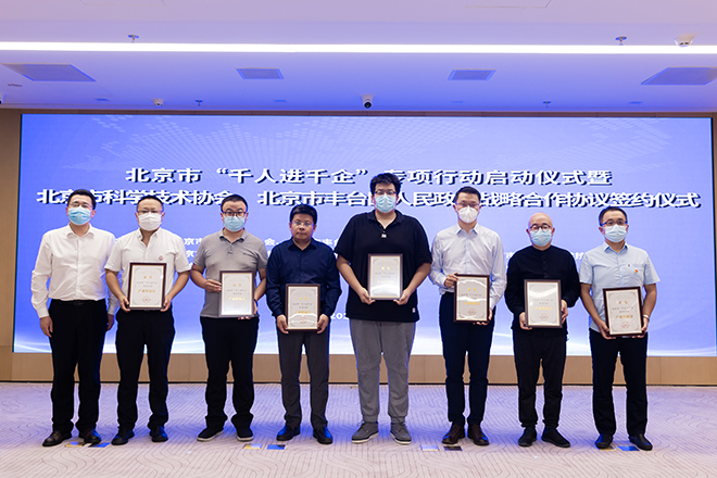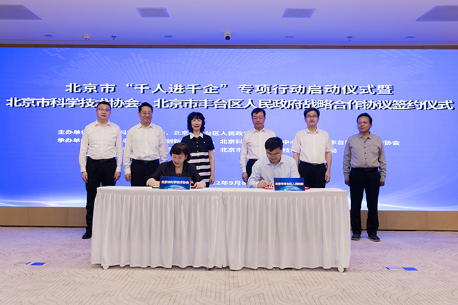 为贯彻落实《北京市关于实施“三大工程”进一步支持和服务高新技术企业发展的若干措施》,加快实施“千人进千企”专项行动,下沉企业和项目一线,点对点、硬碰硬、实打实地为企业和项目纾困解难,助力高质量发展,由北京市科学技术协会、丰台区人民政府主办的北京市“千人进千企”专项行动启动仪式暨北京市科学技术协会、北京市丰台区人民政府战略合作协议签约仪式于9月8日下午成功举办。北京市人民政府副秘书长刘印春出席并讲话。活动由北京市科协党组书记沈洁主持。北京市科协主席、中国科学院院士李静海,北京市科协常务副主席司马红,党组成员、副主席孟凡兴,副主席郭鲁钢,秘书长李金涛;丰台区区委书记王少峰,区委副书记、区政府党组书记、区长初军威,区委副书记、党校校长底志欣,区委常委、区政府党组成员、副区长崔旭龙等领导出席活动。