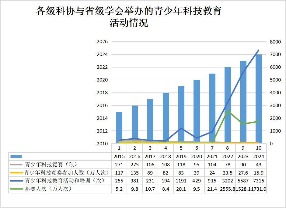 举办青少年科技竞赛43次,参加竞赛的青少年有15.9万人次。举办青少年高校科学营[31]5次,参加营员2,367人。举办青少年科技教育活动和培训[32]7,316次,1,731.0万人次参与。举办港澳台地区青少年科技人文交流活动3场,7,657人次参与。