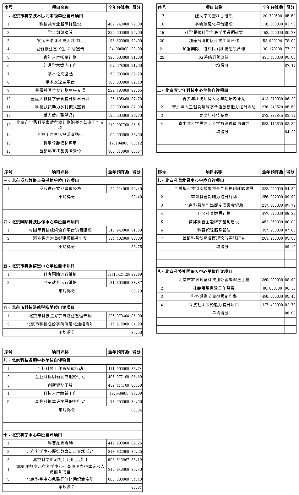北京市科学技术协会对2020年度部门项目支出实施绩效评价,评价项目55个,占部门项目总数的79.71%,涉及金额16105.04万元。其中,部门评价项目1个,涉及金额322.57万元,评价得分为82.50分;单位自评项目54个,涉及金额15782.47万元,评价得分在90(含)-100分的10个、评价得分在80(含)-90分的41个、评价得分在60(含)-80分的2个、评价得分在60分以下的1个。