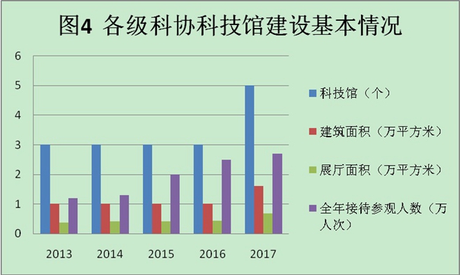 截至2017年底,各级科协拥有所有权或使用权的科技馆[25]5个。总建筑面积15552平方米,展厅面积6754平方米。已实行免费开放的科技馆5个。科技馆全年接待参观人数2.7万人次,其中少年儿童参观人数1.7万人次。科普活动站(中心、室)1137个,全年参加活动(培训)人数200万人次。