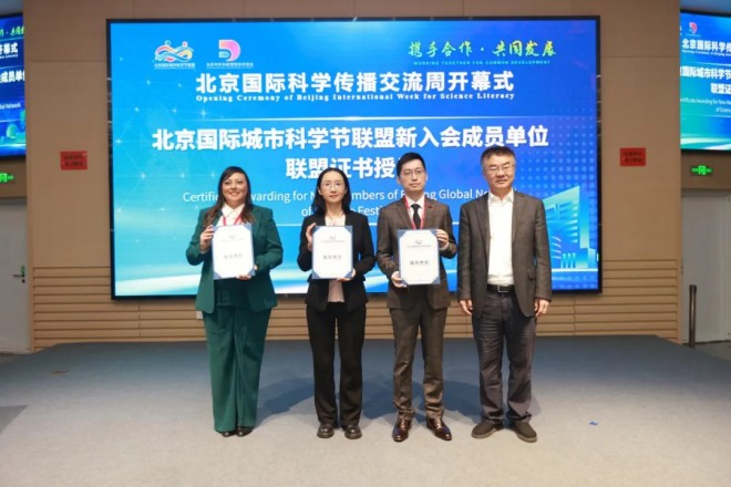 开幕式上,北京国际城市科学节联盟理事会主席丁勇为马耳他探索互动科学中心、瑞典环境科学研究院、赛创未来中东欧创新中心、伊朗马什哈德菲尔多西大学恩加里亚姆天文馆、阿联酋巴赛特教育机构等北京国际城市科学节联盟新入会成员单位颁发证书。