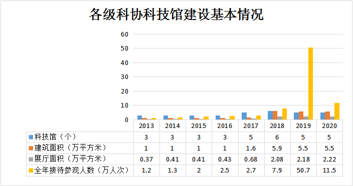 截至2020年底,各级科协拥有所有权或使用权的科技馆[23]5个。总建筑面积55700平方米,展厅面积22168平方米。已实行免费开放的科技馆5个。科技馆全年接待参观人数11.5万人次。流动科技馆4个。科普活动站(中心、室)1121个,全年参加活动(培训)人数85.3万人次。科普画廊建筑面积(宣传栏、宣传橱窗)[24]1.8万平方米,全年展示面积4.9万平方米。科普大篷车8辆,全年下乡次数55次。科普大篷车全年下乡行驶里程0.9万公里,受益人数2.9万人次。