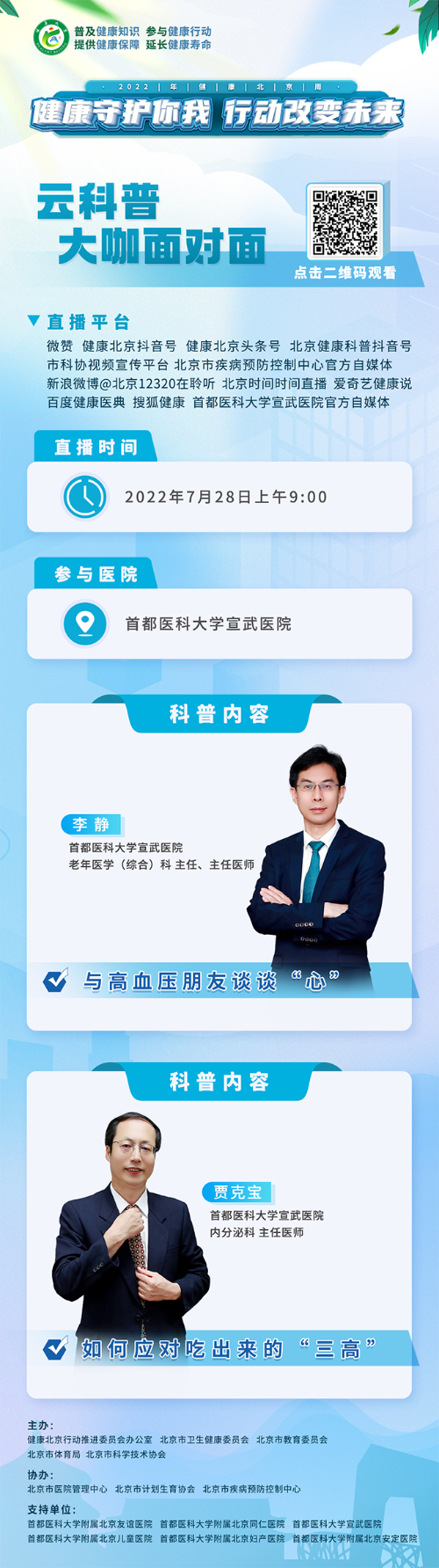 7月28日9:00 首都医科大学宣武医院老年医学(综合)科主任、主任医师李静,首都医科大学宣武医院内分泌科主任医师贾克宝将做客直播间,分别为您解惑“高血压”以及“三高”等热点话题。北京科协视频号将同步进行直播。