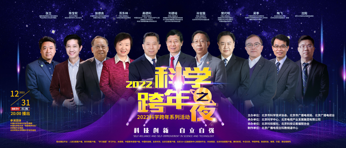 “2022科学跨年之夜”活动由北京市科学技术协会、北京市广播电视局、北京广播电视台主办,北京科学中心、北京电视产业发展集团有限公司承办,北京科技报社、北京科技记者编辑协会协办,北京广播电视台科教频道中心制作。北京市科学技术协会主席、中国工程院院士、中国医学科学院基础医学研究所分子生物学国家重点实验室主任刘德培在节目中致新年贺词,北京市科协党组书记沈洁,党组成员、副主席刘晓勘,党组成员、副主席陈维成出席节目录制。