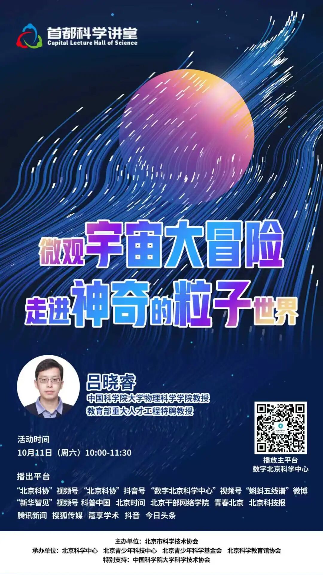 10月11日上午10:00,本期讲座将在“北京科协”视频号、“北京科协”抖音号、“数字北京科学中心”视频号、“北京科学中心”微博、“蝌蚪五线谱”微博、“新华智见”视频号、科普中国、北京时间、北京干部网络学院、青春北京、北京科技报、腾讯新闻、搜狐传媒、蔻享学术等平台同步播出,欢迎大家届时收看。