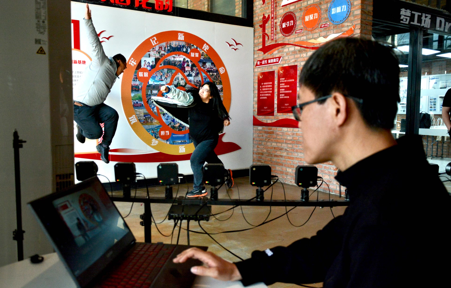 不远处的一间老库房,二层被打通,成为北京容积视觉科技有限公司打造的VR大空间,是技术的展示场所,他们的录制室也在“青创村”里。