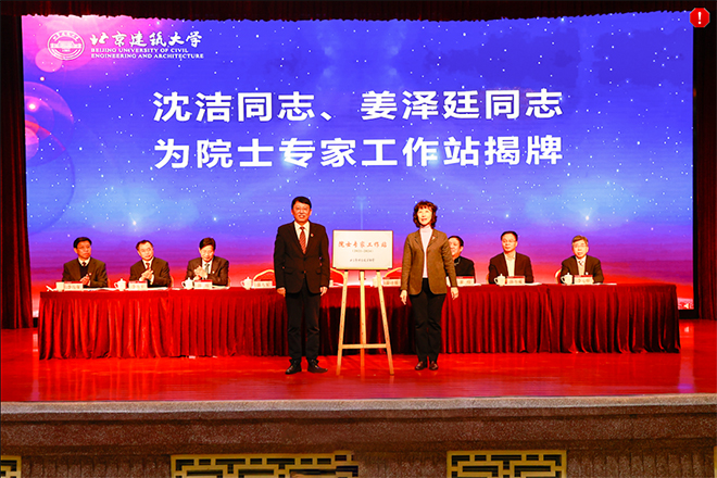 会上,沈洁、姜泽廷共同为北京建筑大学院士专家工作站揭牌。首位入站院士为中国工程院院士、北京未来城市设计高精尖创新中心主任崔愷。北京建筑大学院士专家工作站是在北京高校中建立的首家院士专家工作站,依托北京未来城市设计高精尖创新中心建立,以北京建筑大学学科发展和科技创新需求为导向,以产学研合作项目为纽带,解决学校技术创新和战略发展的相关问题;并将逐步建立长效服务机制,吸引院士及其创新团队向学校集聚,服务于北京建筑大学学科建设、科技创新、人才培养,服务国家、行业和北京市重大战略需求,服务北京“四个中心”建设。在发展方向上,北京建筑大学院士专家工作站将聚焦未来城市设计关键技术,推动交叉学科建设,培养未来“规划师”“设计师”“建筑师”,致力于在城市更新与遗产保护、智慧城市、绿色城市、韧性城市建设等领域形成一批有影响力的科创成果。