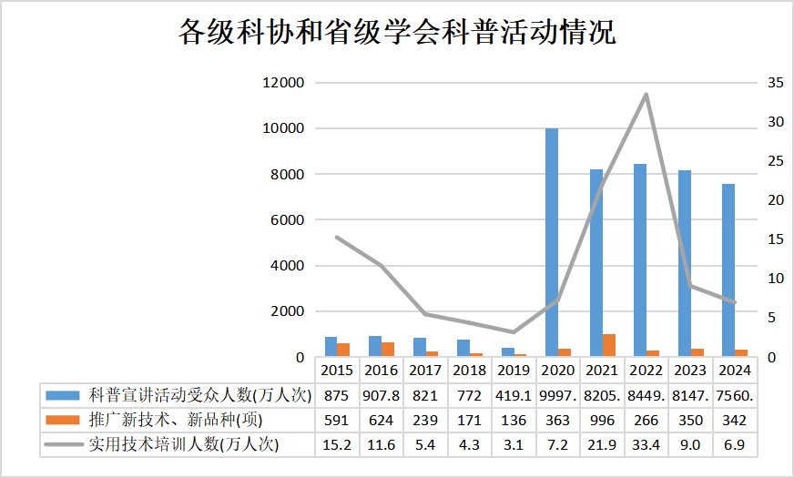 各级科协和省级学会举办科普宣讲活动[30]9,342次,其中专家科普报告会、讲座6,259次,专题展览532次。全国科普日活动1050次。科普宣讲活动受众7560.0万人。举办实用技术培训889次,接受培训6.9万人次。