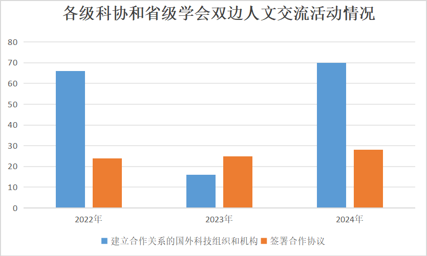 建立合作关系的国外科技组织和机构[37]70个,签署有效合作协议文件28个。组织开展双边科技任务交流活动51场,3,263人次参与。举办“一带一路”相关国际会议和活动16次,857人次参与。联系港澳台科技机构38个,签订协议18个。