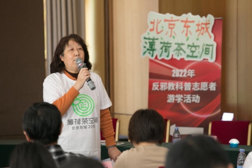 讲座结束后,志愿者们共同观看了东城区“薄荷茶空间”的宣传视频。作为北京市首家反邪教公益组织,“薄荷茶空间”秉持提神醒脑、拒绝邪教的理念,一直致力于扶正祛邪,引导公众远离邪教,帮助邪教受害者回归社会。为增强志愿者对反邪教工作的认识,“薄荷茶空间”的张英老师围绕反邪教科普志愿者工作职责进行了宣讲。