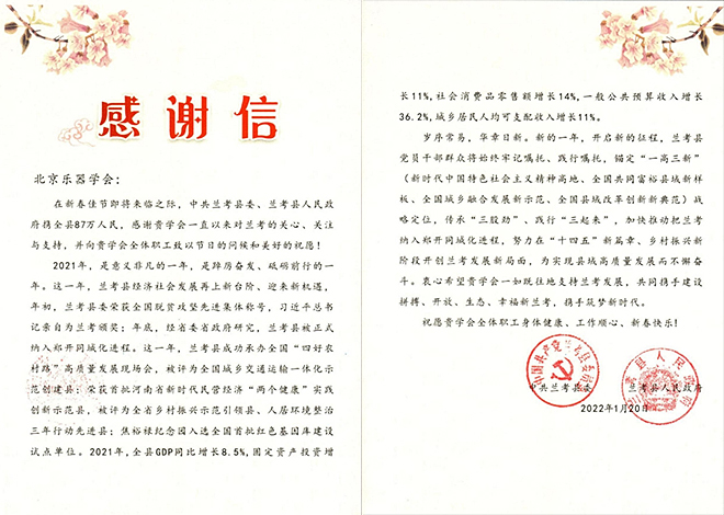 近日,北京乐器学会收到中共兰考县委、兰考人民政府发来的感谢信,信中对学会一直以来对兰考县民族乐器产业发展的关注与支持表示感谢。