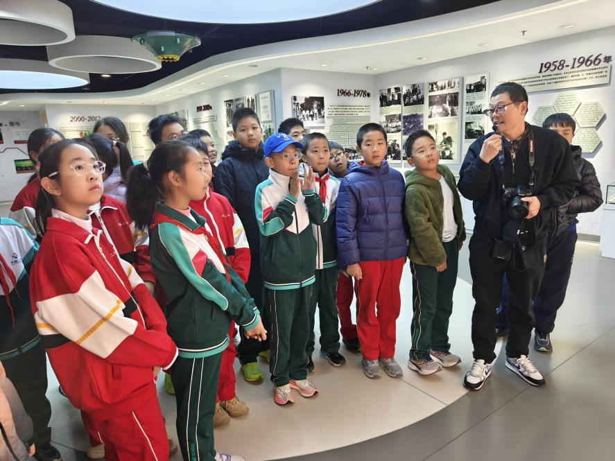 队伍“转战”农科展馆。在讲解员的带领下,同学们沿着时间轴回望农林科学院67年创业路,一张老照片、一粒老种子,让“农科精神”四个字不再抽象。随后走进信息化展厅,数字育种工厂、无人机“巡田”、3D蛋椅轮番登场,同学们体验后感叹:“原来葡萄树VR也如此炫酷,太神奇了!”
